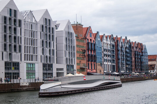 Gdansk, Poland, July 5, 2020. Renaissance style buildings and apartments in Gdansk seen with moving river bridge.