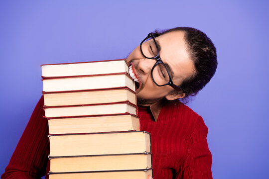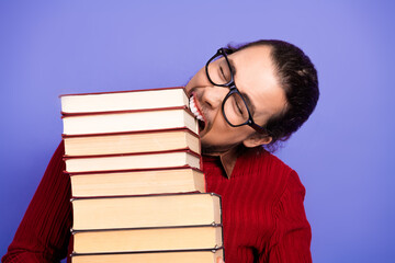 Young handsome student with glasses bites a stack of book for a playful study themed image