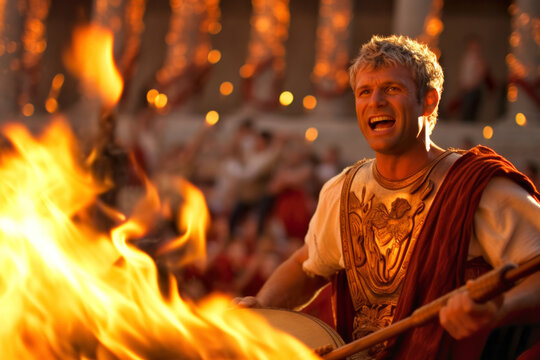 Roman emperor Nero watches Rome burn from a rooftop, cityscape engulfed in flames under an orange sunset. Dramatic digital painting depicts historical event, city destruction, smoke, and inferno.