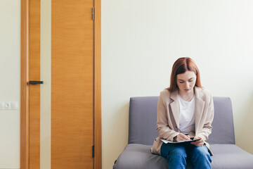 Woman worried in the waiting room corridor, fills out questionnaire tests