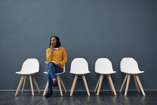 Waiting, tired and black woman for recruitment, hiring or meeting for interview in office. Chairs, yawn and female person as candidate of human resources, exhausted or fatigue with paper in workplace