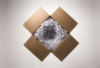 Still life with open cardboard box and shredded paper