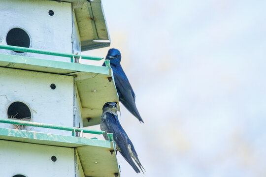 Two purple martins on edge of nesting boxes