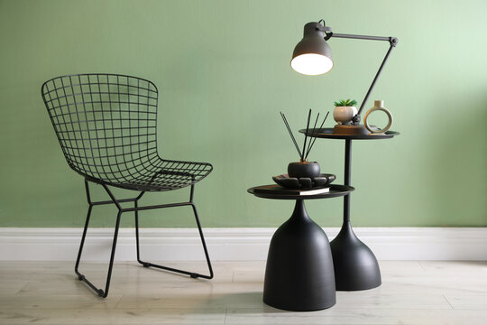 Stylish living room interior. Grey sofa, armchair and nesting tables indoors