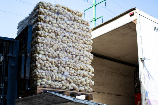 Loading pallet with big net bags full of washed potatoes into a transport truck.