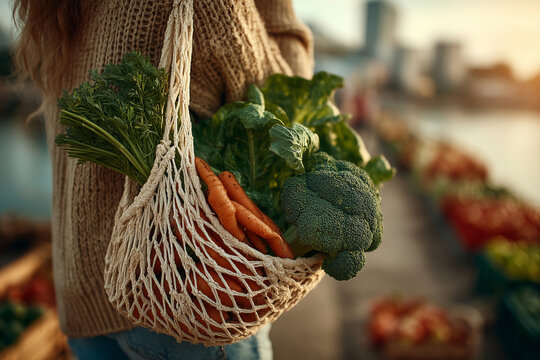 Young adult carries reusable net bag filled with fresh vegetables at market