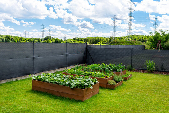 Anthracite-colored masking net placed on a mesh fence, visible vegetable boxes.