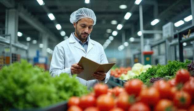 Man in lab coat, hair net checks produce quality at food processing plant. Focus on inspection of fresh vegetables like tomatoes, lettuce. Emphasizes safety, technology, efficient operation in food