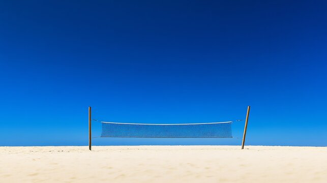 Volleyball net on a desert like sandy court with a brilliant blue sky overhead contrasting against the soft sand and highlighting the minimalist setup for beach volleyball
