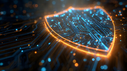 Cybersecurity Shield: A digital shield glows with virant blue and orange hues,symbolizing robust protecton within a complex networ of circuits. It evokes a ense of security, resiliene