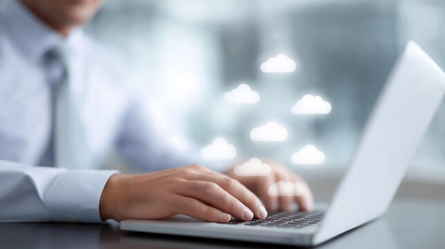 Businessman using laptop with cloud transmission icons defocused, faceless data technology, database visualization detail, blurred office background, storage backup concept, networ
