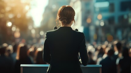 Female speaker addresses an engaged audience at a corporate business conference in a bright venue during the afternoon