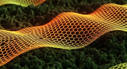Abstract 3D rendering of a textured surface with undulating mesh of hexagonal shapes in gradient orange and yellow over a dark green background.