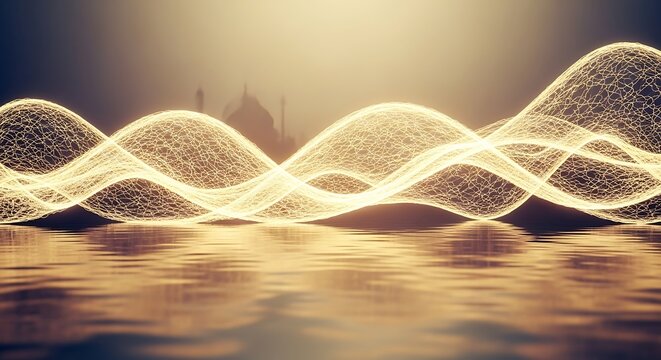 Abstract digital wave pattern over a textured water surface with a gradient blue and yellow background