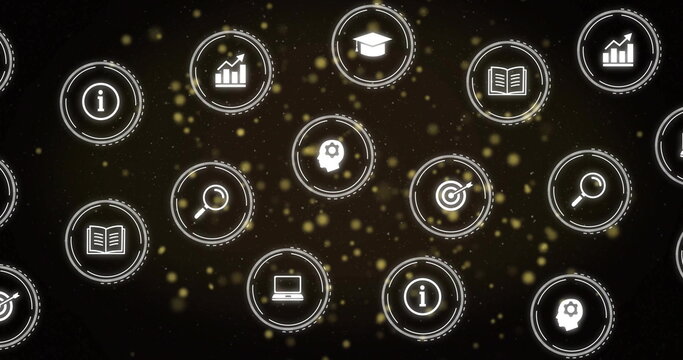 Image of data processing over netwrok of connections with icons on black background