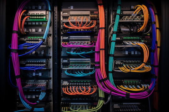 Colorful multiple twisted-pair cables plugged into network switches. Generative AI