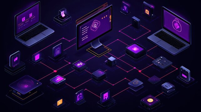 isometric computer technology illustration with pc, laptop, and mobile devices on desk - programming software and app development concept