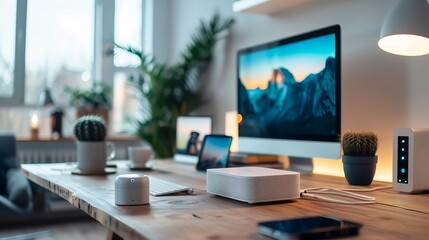A minimalist photo of a newage home router set up on a home office desk, surrounded by smart home devices it connects, illustrating the central role it plays in home networking