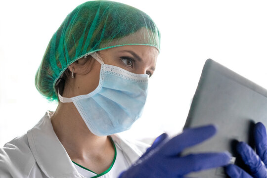 Female doctor using tablet with global health data overlay for telemedicine and diagnostics