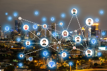 People icons network and communication concept. Double exposure