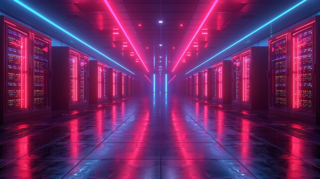 Server room hosting glowing with blue and pink neon lights reflecting on the wet floor in a data center