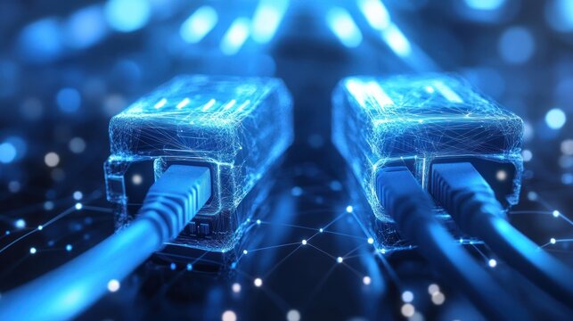 Network server hardware showing connected cables, lights, and abstract digital overlay suggesting data transmission and connectivity