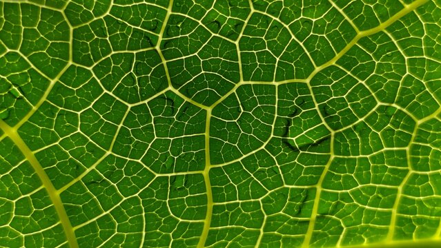 Close-up of a vibrant green papaya leaf showcasing its intricate network of veins, creating a detailed, natural pattern.