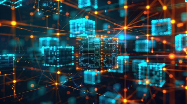 Blockchain network failure with disconnected nodes, cybernetic tone, complementary color scheme, front view, representing system breakdown