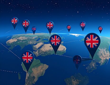 Global industrial network connectivity concept featuring world globe with cargo icons, connected trade routes, regional flags and industrial zones illustrating international logistics