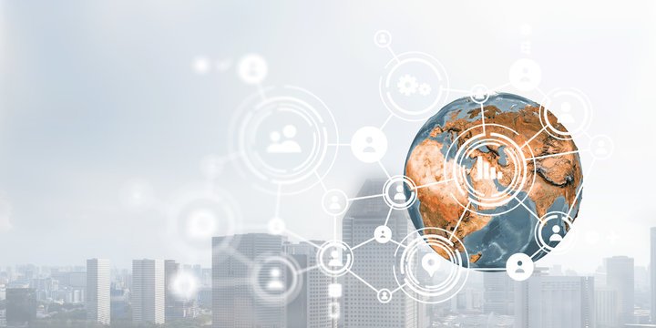 Global network connection covering earth with link of innovative perception . Concept of international trading and digital investment, 5G global wireless connection and future of internet of things .