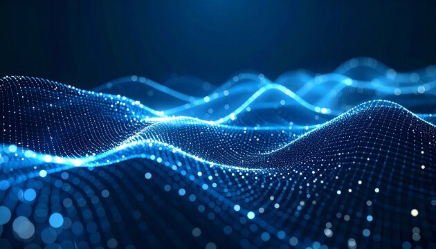 Abstract digital landscape with flowing blue waves of light particles, representing data streams and connectivity.