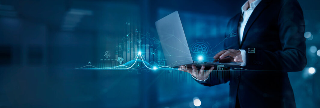Employee using a laptop with business analytics dashboard in a modern warehouse, showing real-time data monitoring and smart supply chain management for logistics and inventory control.