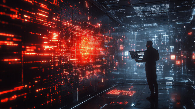 cybersecurity specialist is analyzing data in futuristic digital environment filled with glowing red and blue graphics. scene conveys sense of urgency and high tech analysis