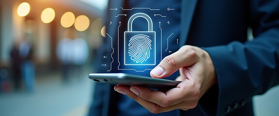 Person holding mobile phone showing glowing digital lock and fingerprint icon for secure cloud authentication and privacy