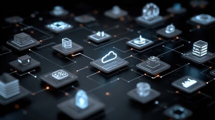 Businessman's hand selecting a glowing cloud technology icon on a futuristic digital tablet screen for business services.