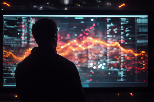 Man observes real time network performance metrics on a large digital display in a data analysis environment during evening hours