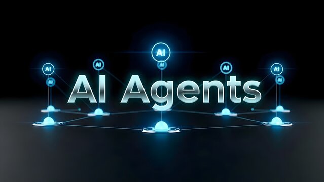 AI Agents Text in Glowing Network with Node Icons on Dark Background