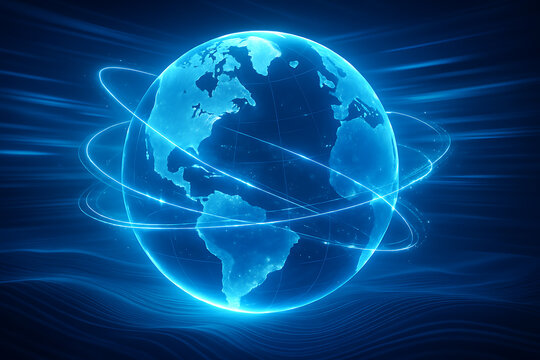 Futuristic glowing Earth with digital energy rings symbolizing global connectivity