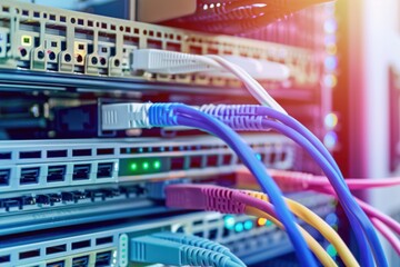 close-up of a network switch with multiple patch cords plugged into its ports. The patch cords are color-coded