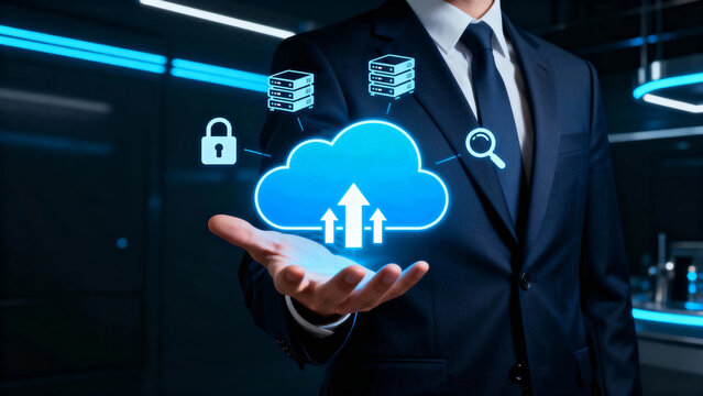 Businessman presenting cloud computing concept with data security and storage icons in a futuristic setting