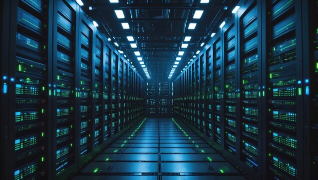 Rows of advanced server racks with glowing blue lights in a modern data center facility.