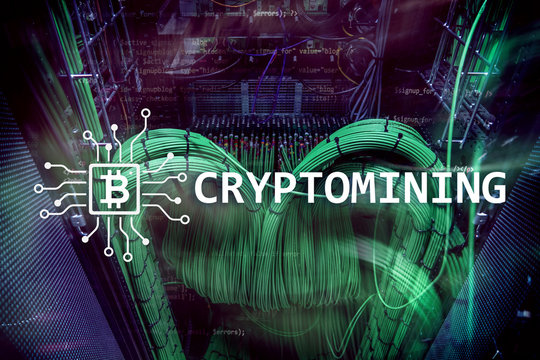 Cryptocurrency mining concept on server room background.?