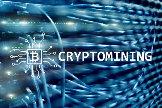 Cryptocurrency mining concept on server room background.