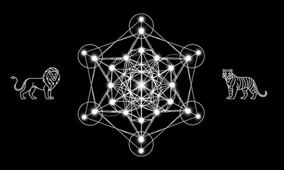 Glowing geometric network with lion and tiger symbols on black background