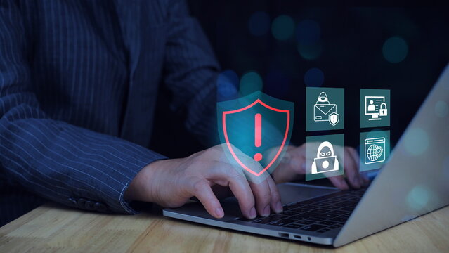Person using a laptop with a cybersecurity warning message on the screen, symbolizing data breach, hacking threat, online security risks, cyber attack prevention, and digital privacy protection