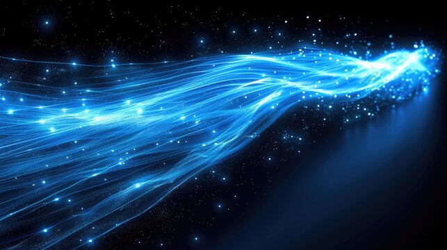 A blue light trail with glowing particles on black background, representing fast digital data transfer in the internet and network connection technology concept. futuristic speed of information.