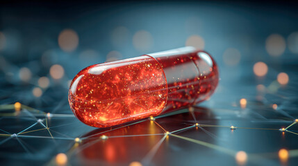 Close-up of a glowing red capsule resting on a futuristic digital network surface symbolizing advanced technology and innovation in medical science and pharmaceuticals