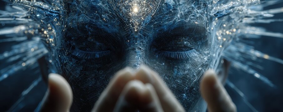 Futuristic and dynamic background featuring an AI robot head formed from interconnected network nodes
