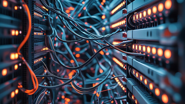 Network server with glowing lights and tangled cables conveys the complexity of modern data centers and internet infrastructure.