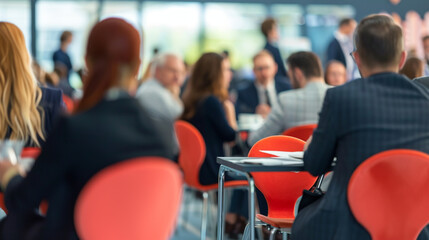 Business people engaging in a speed networking session, business conference, blurred background, with copy space